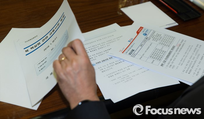 (서울=포커스뉴스) 북한이 수소탄 실험에 성공했다고 발표한 6일 오후 서울 중구 은행회관에서 열린 긴급 거시경제금융회의에 참석한 관계자가 관련 자료를 보고 있다.