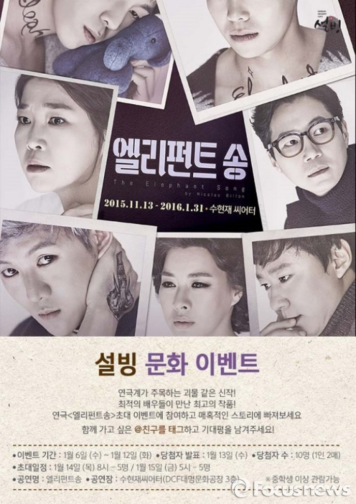 한편, 연극 '엘리펀트송'은 주인공 마이클의 사랑에 대한 상처를 풀어낸 작품이다. 2004년 캐나다 스트랫퍼드 축제에서 초연된 후 프랑스 파리의 몽파르나스 극장에서 100회 이상 공연됐다.설빙의 엘리펀트송 초대권 증정 이벤트 포스터 <사진제공=설빙>