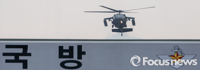 (서울=포커스뉴스) 북한이 수소폭탄 실험에 성공했다고 주장하고 있는 6일 오후 서울 국방부 청사에 UH-60 블랙호크 헬기가 착륙을 하고 있다.