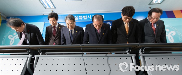 (서울=포커스뉴스) 6일 오후 서울 종로구 서울특별시교육청에서 전국 시도교육감이 정부의 누리과정 예산 미편성 시 강력 대처 발표 관련 긴급 기자회견에 앞서 인사를 하고 있다. 왼쪽부터 조희연 서울시 교육감, 김승환 전라북도 교육감, 이재정 경기도 교육감, 장휘국 광주시 교육감, 이청연 인천시 교육감, 민병희 강원도 교육감.