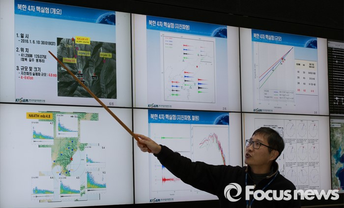 (대전=포커스뉴스) 북한이 수소탄 핵실험을 성공했다고 발표한 가운데 6일 오후 대전 유성구 한국지질자원연구원 지진연구센터에서 신진수 국토지질연구본부장이 북한 수소탄 실험에 대한 조사결과 브리핑을 하고 있다.