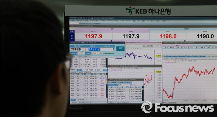 (서울=포커스뉴스) 코스피 지수가 전거래일 보다 5.10포인트(0.26%) 하락한 1,925.43에 거래를 마치며, 북한의 수소탄 실험에도 1920선을 지킨 6일 오후 서울 중구 KEB하나은행 본점 딜링룸에서 딜러들이 업무를 보고 있다. 이날 원달러 환율은 전거래일 보다 9.9원 오른 1197.9원에 마감하며, 지난해 9월 1200.9원 이후 4개월 만에 최고치를 기록 했다.