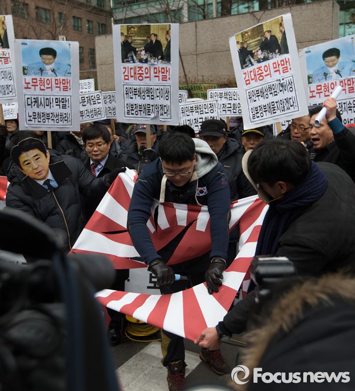 (서울=포커스뉴스) 6일 오후 서울 종로구 위안부 소녀상 앞에서 올해로 24주년을 맞은 일본군 위안부 문제 해결을 위한 1212차 수요 시위가 열린 직후 어버이연합 회원들이 욱일승천기를 찢고 있다.