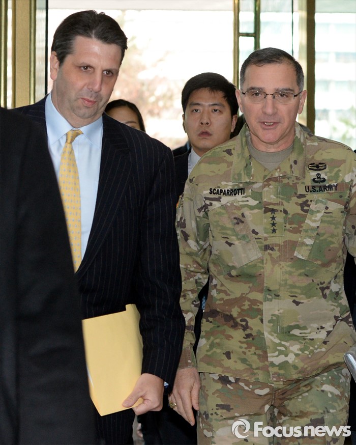 (서울=포커스뉴스) 북한이 첫 수소탄 핵실험을 실시했다고 발표한 6일 오후 서울 종로구 외교부청사에서 마크 리퍼트(왼쪽) 주한 미대사와 커티스 스캐퍼로티 한미연합사령관이 발걸음을 옮기고 있다.