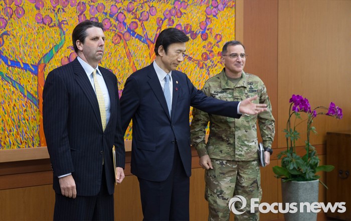 (서울=포커스뉴스) 북한이 첫 수소탄 실험에 성공했다고 발표한 6일 오후 윤병세(중앙) 외교부 장관이 서울 도렴동 외교부를 방문한 마크 리퍼트(왼쪽) 주한 미국대사, 커티스 스캐퍼로티 주한미군사령관과 함께 기념 촬영을 하고 있다.