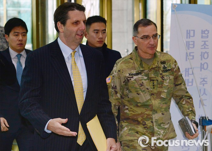 (서울=포커스뉴스) 북한이 첫 수소탄 핵실험을 실시했다고 발표한 6일 오후 서울 종로구 외교부청사에서 마크 리퍼트(왼쪽) 주한 미대사와 커티스 스캐퍼로티 한미연합사령관이 발걸음을 옮기고 있다.