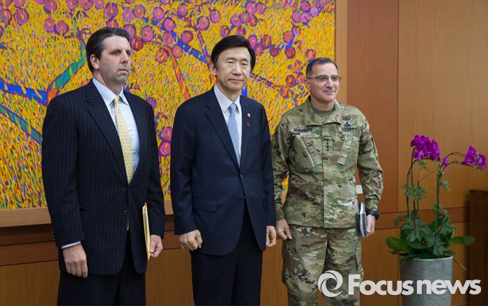 (서울=포커스뉴스) 북한이 첫 수소탄 실험에 성공했다고 발표한 6일 오후 윤병세(중앙) 외교부 장관이 서울 도렴동 외교부를 방문한 마크 리퍼트(왼쪽) 주한 미국대사, 커티스 스캐퍼로티 주한미군사령관과 함께 기념 촬영을 하고 있다.