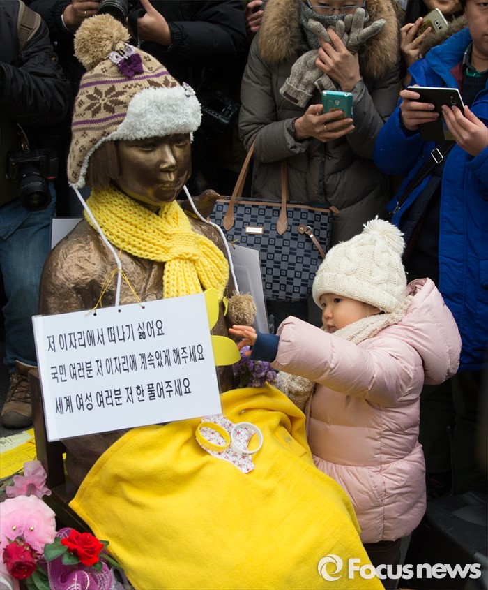 (서울=포커스뉴스) 6일 오후 서울 종로구 위안부 소녀상 앞에서 올해로 24주년을 맞은 일본군 위안부 문제 해결을 위한 1212차 수요 시위가 열리고 있는 가운데 한 아이가 소녀상을 어루만지고 있다.