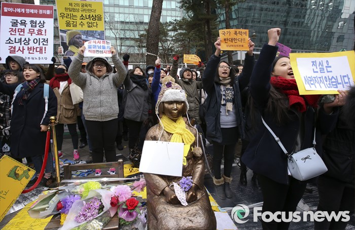 (서울=포커스뉴스) 6일 서울 종로구 옛 일본대사관 앞에서 열린 제1212차 정기수요집회에서 참석자들이 구호를 외치고 있다. 단일 주제로 벌이는 세계 최장기 집회로 알려진 정기수요집회는 1992년 1월 8일 시작해 금일로 24주년을 맞이했다.