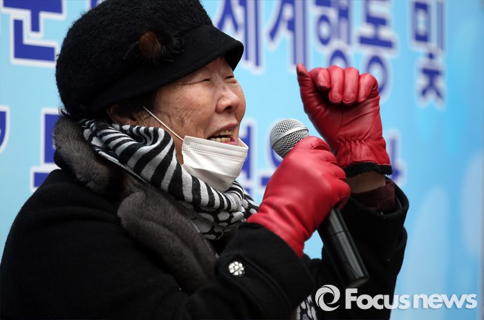 (서울=포커스뉴스) 일본군 위안부 문제 해결을 위한 정기 수요집회 24주년인 6일 오후 서울 종로구 주한일본대사관 앞 소녀상 주변에서 열린 집회에서 이용수 할머니가 구호를 외치고 있다.