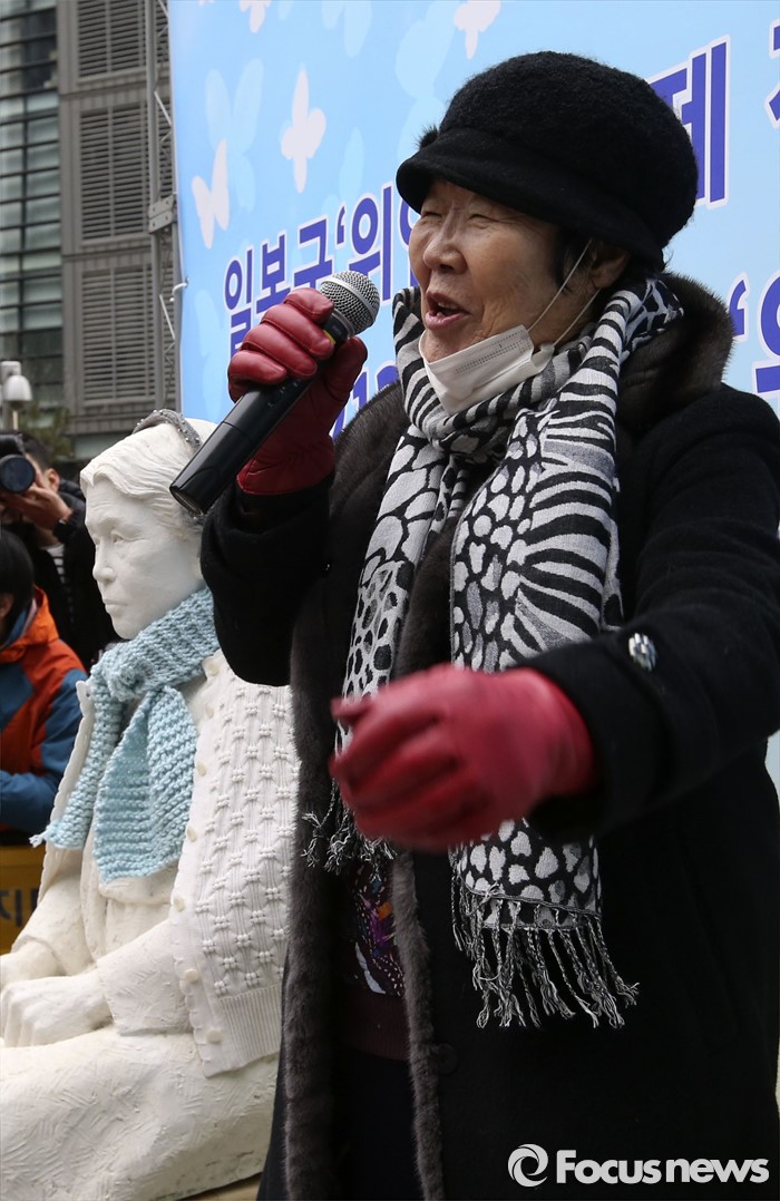 (서울=포커스뉴스) 6일 서울 종로구 옛 일본대사관 앞에서 열린 제1212차 정기수요집회에서 이용수 할머니가 발언하고 있다. 옆은 김학순 할머니 석상. 단일 주제로 벌이는 세계 최장기 집회로 알려진 정기수요집회는 1992년 1월 8일 시작해 금일로 24주년을 맞이했다.