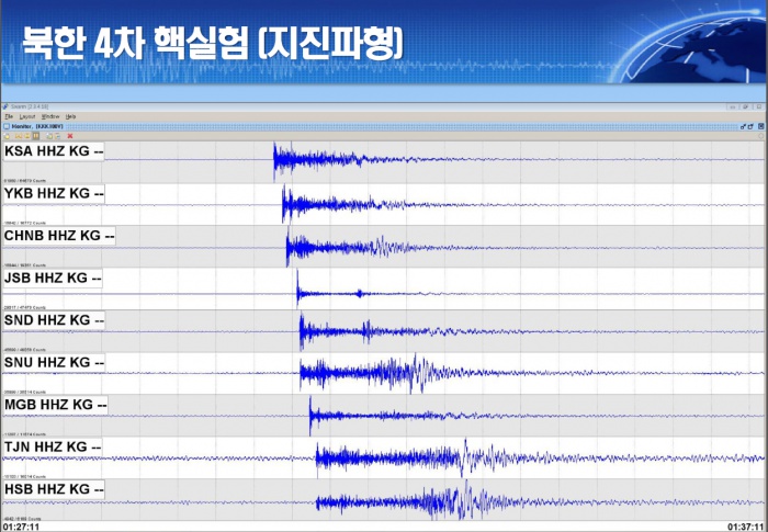 (서울=포커스뉴스) 북한이 4차 핵실험을 감행한 6일 오후 대전 유성구 한국지질자원연구원 지진연구센터에서 공개한 북한 4차 핵실험 지진파형 자료. <사진제공=한국지질자원연구원 지진연구센터>