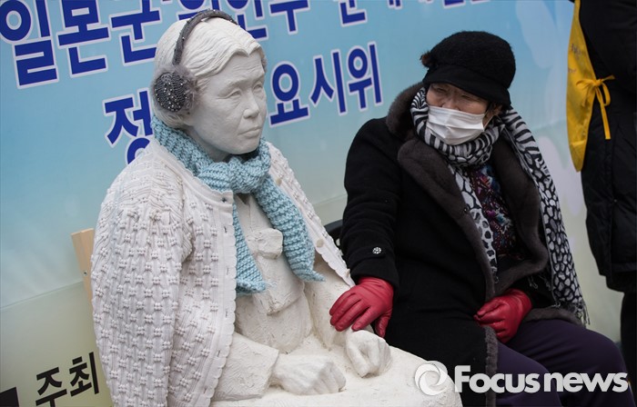 (서울=포커스뉴스) 6일 오후 서울 종로구 중학동 일본대사관 앞에서 열리는 일본군 위안부 문제 해결을 위한 수요시위가 24주년을 맞이한 가운데 위안부 피해 이용수(89) 할머니가 김학순 할머니의 동상을 어루만지고 있다.