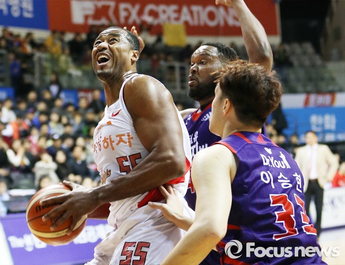(고양=포커스뉴스) 6일 고양체육관에서 열린 2015-2016 프로농구 오리온-SK 경기에서 SK 사이먼이 골밑에서 오리온 존슨, 이승현의 마크를 받으며 슈팅을 노리고 있다.