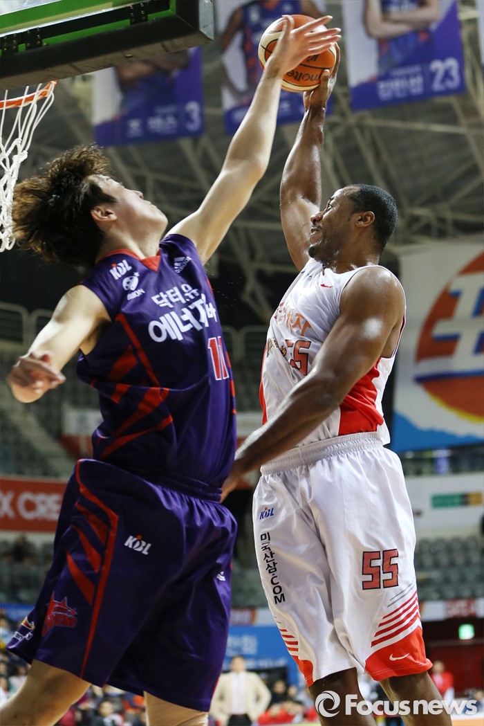 (고양=포커스뉴스) 6일 고양체육관에서 열린 2015-2016 프로농구 오리온-SK 경기에서 SK 사이먼이 오리온 허일영의 마크를 피해 원핸드 덩크슛을 시도하고 있다.