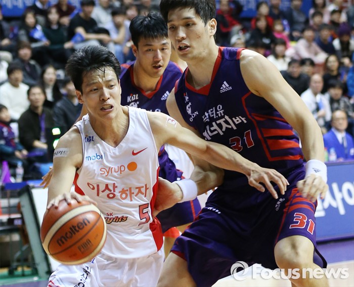 (고양=포커스뉴스) 6일 고양체육관에서 열린 2015-2016 프로농구 오리온-SK 경기에서 SK 김선형이 오리온 장재석을 제치며 골밑 돌파를 시도하고 있다.