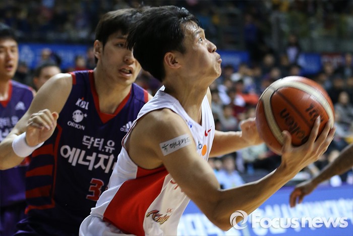 (고양=포커스뉴스) 6일 고양체육관에서 열린 2015-2016 프로농구 오리온-SK 경기에서 SK 김선형이 골밑 돌파후 리버스 레이업슛을 노리고 있다.