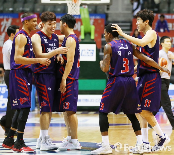 (고양=포커스뉴스) 6일 고양체육관에서 열린 2015-2016 프로농구 오리온-SK 경기에서 SK에 5점차 승리를 거둔 오리온 선수들이 조 잭슨의 머리를 쓰다듬으며 기뻐하고 있다.