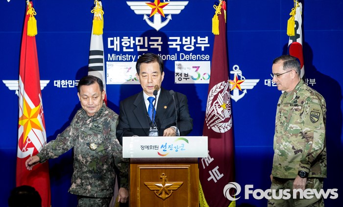 (서울=포커스뉴스) 한민구(가운데) 국방부 장관을 비롯한 이순진(왼쪽) 합참의장, 커티스 스캐퍼로티 주한미군사령관이 7일 오전 서울 용산구 국방부에서 북한 수소탄 실험에 대한 한미 양국 공조 방안을 발표하기 위해 브리핑룸으로 들어서고 있다.