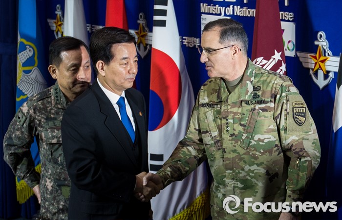 | △ 악수하는 한민구 국방부 장관-스캐퍼로티 주한미군 사령관 |