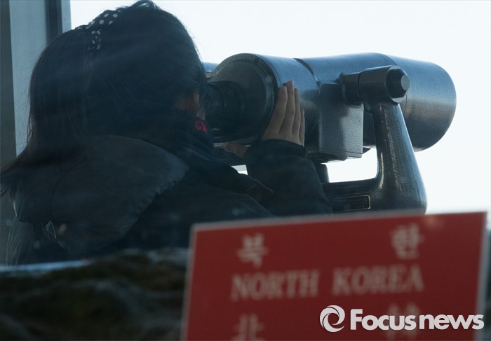 (파주=포커스뉴스) 7일 오전 경기도 파주 오두산 통일전망대에서 관광객이 망원경을 통해 황해북도 개풍군 일대를 관측하고 있다.