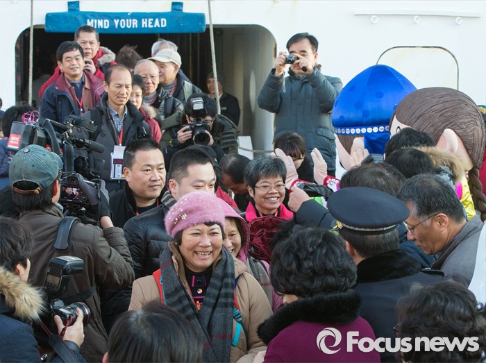 (동해=포커스뉴스) 7일 오전 강원 동해항 중앙부두에 입항한 중국 천해크루즈사의 스카이씨 골든 에라호에서 중국인 관광객들이 하선하고 있다. 이날 강원도를 찾은 관광객 1천800여 명은 정선 강원랜드 눈썰매장, 평창 용평·알펜시아스키장, 속초 중앙시장, 설악산 등을 둘러볼 예정이다.