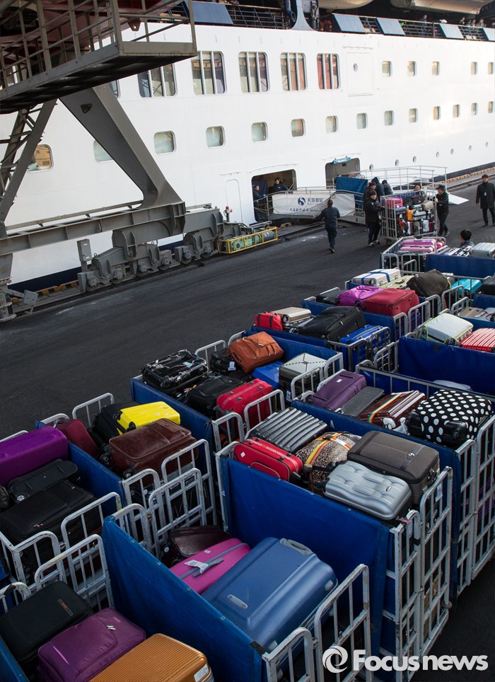 (동해=포커스뉴스) 7일 오전 강원 동해항 중앙부두에 입항한 중국 천해크루즈사의 스카이씨 골든 에라호에서 직원들이 관광객들의 짐을 내리고 있다. 이날 강원도를 찾은 관광객 1천800여 명은 정선 강원랜드 눈썰매장, 평창 용평·알펜시아스키장, 속초 중앙시장, 설악산 등을 둘러볼 예정이다.