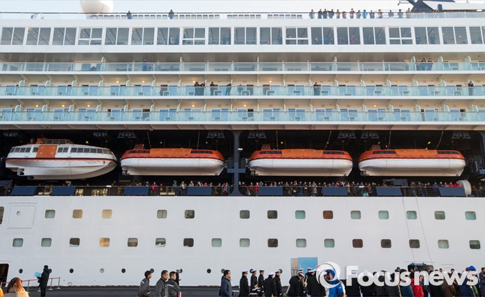 (동해=포커스뉴스) 7일 오전 강원 동해항 중앙부두에 입항한 중국 천해크루즈사의 스카이씨 골든 에라호에서 중국인 관광객들이 하선을 기다리고 있다. 이날 강원도를 찾은 관광객 1천800여 명은 정선 강원랜드 눈썰매장, 평창 용평·알펜시아스키장, 속초 중앙시장, 설악산 등을 둘러볼 예정이다.