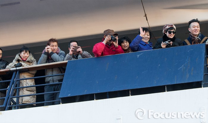 (동해=포커스뉴스) 7일 오전 강원 동해항 중앙부두에 입항한 중국 천해크루즈사의 스카이씨 골든 에라호에서 중국인 관광객들이 하선을 기다리고 있다. 이날 강원도를 찾은 관광객 1천800여 명은 정선 강원랜드 눈썰매장, 평창 용평·알펜시아스키장, 속초 중앙시장, 설악산 등을 둘러볼 예정이다.