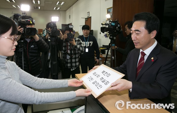 (서울=포커스뉴스) 박수현 더불어민주당 원내대변인이 7일 오전 서울 여의도 국회 의안과에서 북한 4차 핵실험 규탄 결의안을 제출하고 있다.