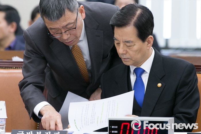 (서울=포커스뉴스) 한민구(오른쪽) 국방부 장관과 류제승 국방정책실장이 7일 오전 서울 여의도 국회에서 북한의 수소탄 핵실험과 관련해 열린 국방위원회 전체회의에 출석해 현안보고 전, 논의하고 있다.