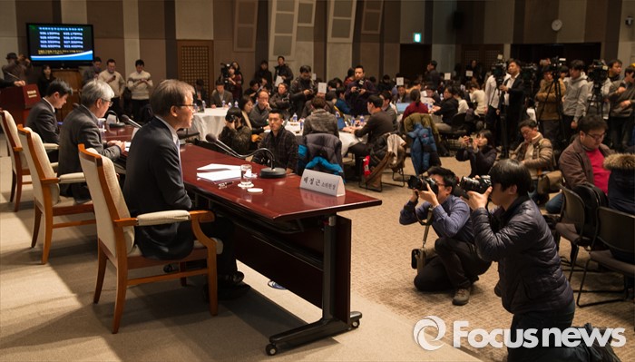 (서울=포커스뉴스) 인터넷 포털 네이버와 카카오의 뉴스 제휴 심사를 담당할 '뉴스제휴평가위원회'가 7일 오전 서울 중구 프레스센터에서 '네이버-카카오 뉴스 제휴 및 제재 심사 규정'을 발표하는 기자간담회를 진행하고 있다.