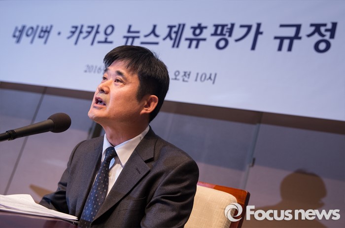 (서울=포커스뉴스) 인터넷 포털 네이버와 카카오의 뉴스 제휴 심사를 담당할 '뉴스제휴평가위원회'가 7일 오전 서울 중구 프레스센터에서 '네이버-카카오 뉴스 제휴 및 제재 심사 규정'을 발표하는 기자간담회를 진행하고 있다. 김병희 제 2 소위원장이 세부 규정에 대해 발표하고 있다.