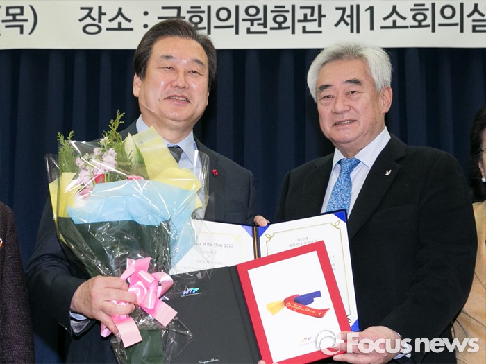 (서울=포커스뉴스) 김무성(왼쪽) 새누리당 대표가 7일 오전 서울 여의도 국회 의원회관에서 열린 대한민국 제19대 국회의원 의정대상 시상식에서 특별공로상을 받고 있다.