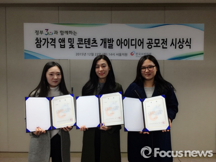 앱을 통해 사이트에서 제공되는 생필품 가격정보를 한눈에 볼 수 있을 뿐만 아니라, 스마트폰에 특화된 맞춤형 서비스를 이용할 수 있다.한국소비자보호원 개최 '참가격 앱 및 콘텐츠 개발 아이디어 공모전'에서 우수상을 수상한 소비자정보학과 박지영, 이수윤, 위수연 학생, <사진제공=서울 건국대학교>