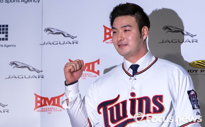 (서울=포커스뉴스) 미네소타 트윈스에 입단한 박병호가 7일 오전 서울 서대문구 그랜드힐튼호텔에서 기자회견을 열고 메이저리그 진출에 대한 소감과 포부를 밝힌 뒤 미네소타 트윈즈 유니폼을 입고 포즈를 취하고 있다.