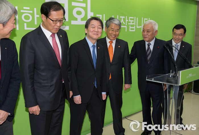 (서울=포커스뉴스) 7일 오후 서울 마포구 신당 당사에서 김근식(왼쪽부터) 경남대 교수, 문병호, 안철수, 김동철, 김한길, 임내현 무소속 의원이 국민공감포럼 신당 참여 기자회견과 북한 핵실험 관련 성명 발표를 마치고 이동하고 있다.