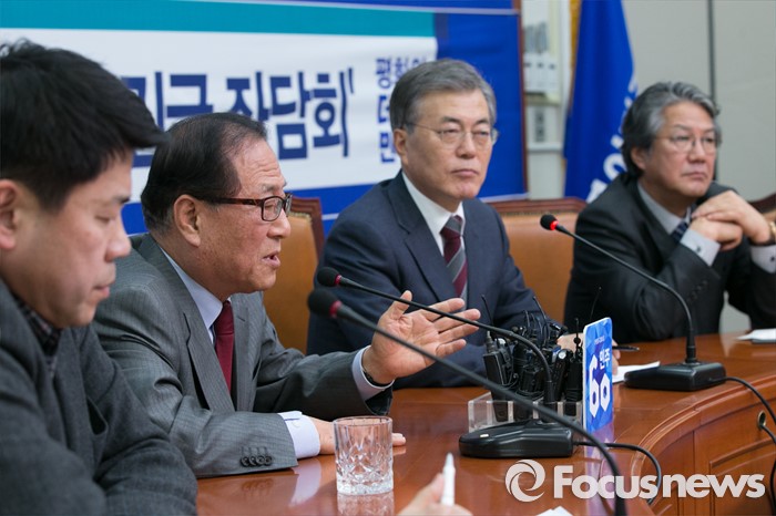 (서울=포커스뉴스) 정세현(왼쪽 두번째) 전 통일부 장관이 7일 오후 서울 여의도 국회 더불어민주당 대표실에서 열린 '북한 핵실험 관련 전문가 긴급 좌담회'에 참석해 발언하는 동안, 문재인(오른쪽 두번째) 대표를 비롯한 참석자들이 경청하고 있다.