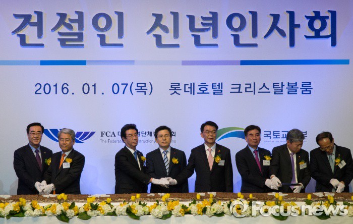 (서울=포커스뉴스) 황교안 국무총리가 7일 오후 서울 중구 롯데호텔에서 열린 2016 건설인 신년인사회에 참석해 시루떡을 자르고 있다. 왼쪽 세번째부터 최삼규 대한건설단체총연합회장, 황교안 국무총리, 강호인 국토교통부 장관.