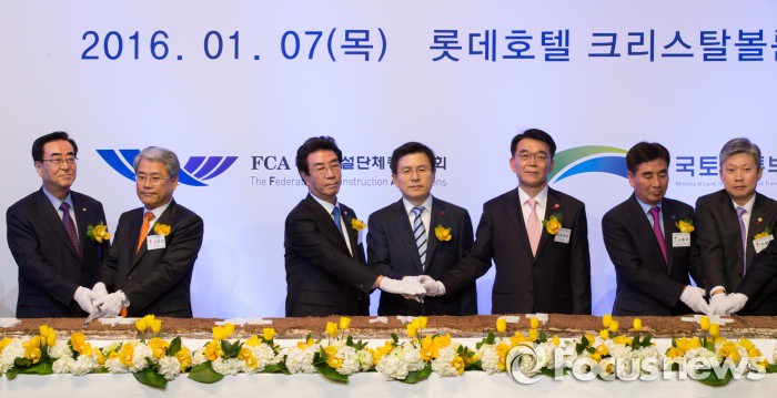 (서울=포커스뉴스) 황교안 국무총리가 7일 오후 서울 중구 롯데호텔에서 열린 2016 건설인 신년인사회에 참석해 시루떡을 자르고 있다. 왼쪽 세번째부터 최삼규 대한건설단체총연합회장, 황교안 국무총리, 강호인 국토교통부 장관.