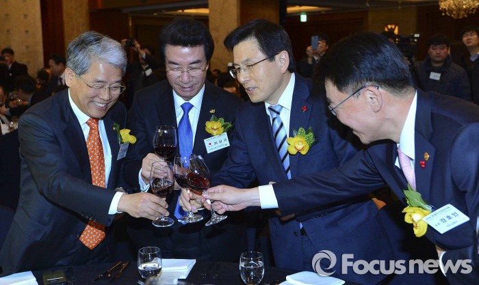 (서울=포커스뉴스) 황교안 국무총리(오른쪽 두 번째)와 참석자들이 7일 오후 서울 중구 롯데호텔에서 열린 건설인 신년인사회에서 건배를 하고 있다. 왼쪽부터 김동철 의원, 최삼규 대한건설협회 회장, 황 총리, 강호인 국토교통부 장관.