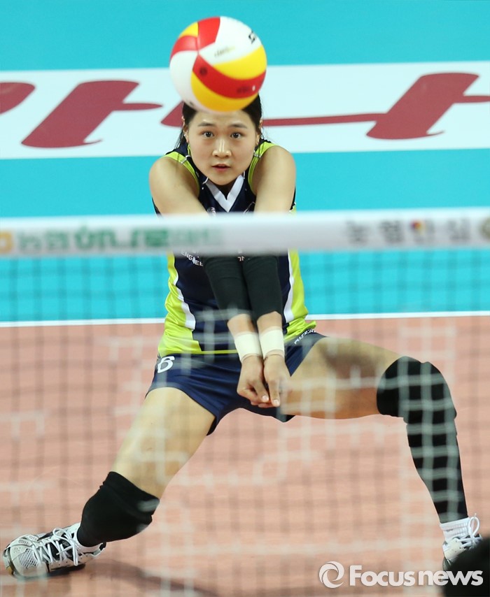 (서울=포커스뉴스) 7일 장충체육관에서 열린 '2015-2016NH농협 V-리그' 여자부 GS칼텍스-현대건설 경기에서 현대건설 리베로 김연견이 리시브하고 있다.