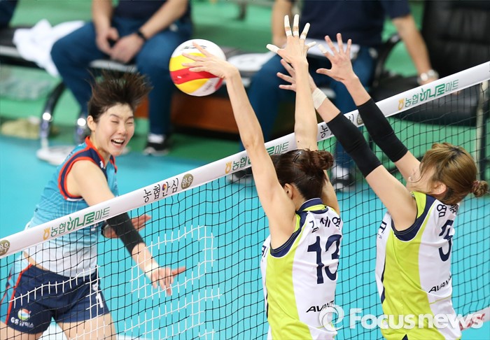 (서울=포커스뉴스) 7일 장충체육관에서 열린 '2015-2016NH농협 V-리그' 여자부 GS칼텍스-현대건설 경기에서 현대건설 김세영, 염혜선이 GS칼텍스 이소영의 공격을 블로킹으로 막고 있다.
