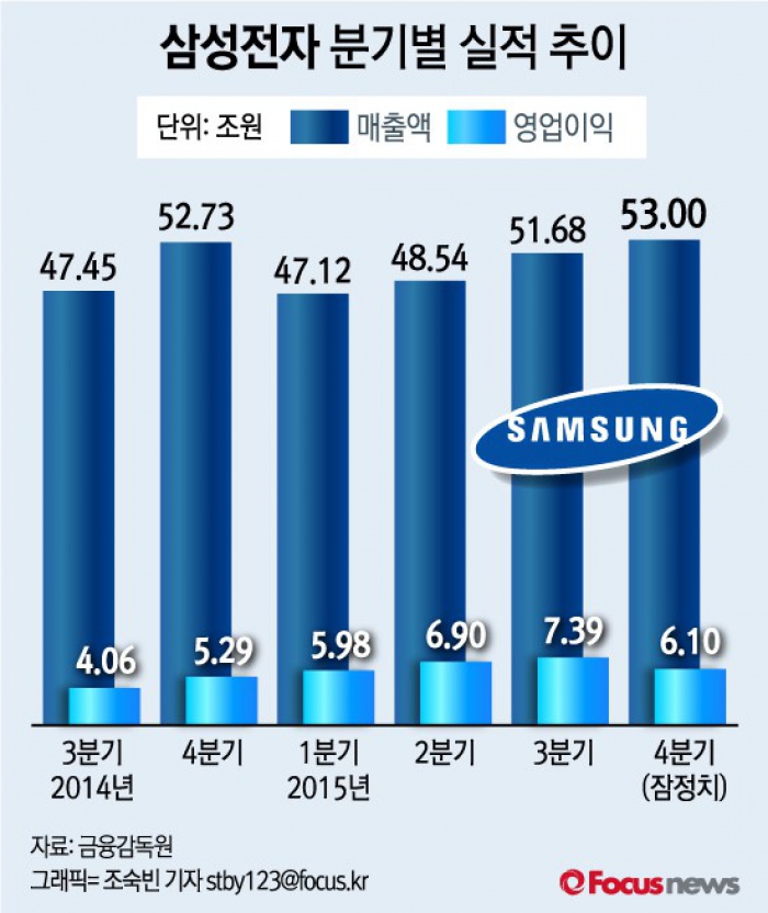 한편 삼성전자는 결산이 종료되지 않은 가운데 투자자들의 편의를 돕는 차원에서 2009년 7월부터 국내 기업 최초로 분기실적 예상치를 제공하고 있다. 보다 정확한 실적은 이달 말 공개 예정이다.(서울=포커스뉴스) 삼성전자는 지난해 4분기 영업이익(잠정치)은 6조1천억원, 매출은 53조원이라고 8일 공시했다. 2016.01.08 조숙빈 기자