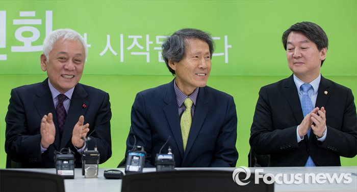 (서울=포커스뉴스) 8일 오전 서울 마포구 안철수 무소속 의원 당사 대회의실에서 열린 창당준비점검회의에 참석한 한상진 공동창당준비위원장이 김한길(왼쪽), 안철수 의원에게 박수 받고 있다.