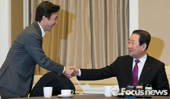 (서울=포커스뉴스) 더불어민주당을 탈당해 신당을 추진 중인 김민석(왼쪽) 전 의원과 박주선 의원이 8일 오전 서울 여의도 국회 귀빈식당에서 신당 통합 논의를 위해 만나 인사하고 있다.
