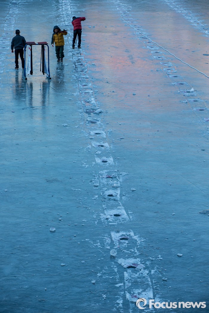 (화천=포커스뉴스) 강원중북부 지역에 한파주의보가 발효된 8일 오전 강원도 화천군 산천어축제 행사장인 화천천 얼음벌판에서 축제 관계자들이 행사장 점검을 하고 있다.