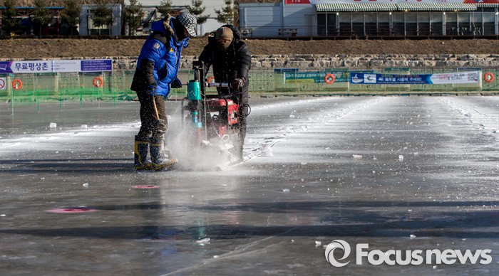(화천=포커스뉴스) 강원중북부 지역에 한파주의보가 발효된 8일 오전 강원도 화천군 산천어축제 행사장인 화천천 얼음벌판에서 축제 관계자들이 낚시 구멍을 뚫고 있다.