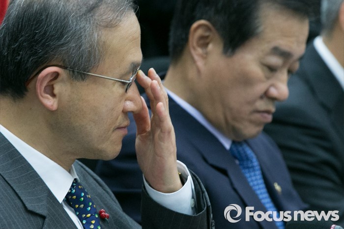 (서울=포커스뉴스) 임성남(왼쪽) 외교부 1차관이 8일 오전 서울 여의도 국회 새누리당 정책위원회에서 열린 북핵 관련 전문가 간담회에 참석해 생각에 잠겨 있다.