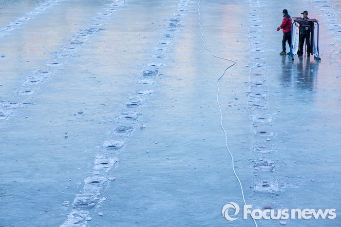 (화천=포커스뉴스) 강원중북부 지역에 한파주의보가 발효된 8일 오전 강원도 화천군 산천어축제 행사장인 화천천 얼음벌판에서 축제 관계자들이 행사장 점검을 하고 있다.
